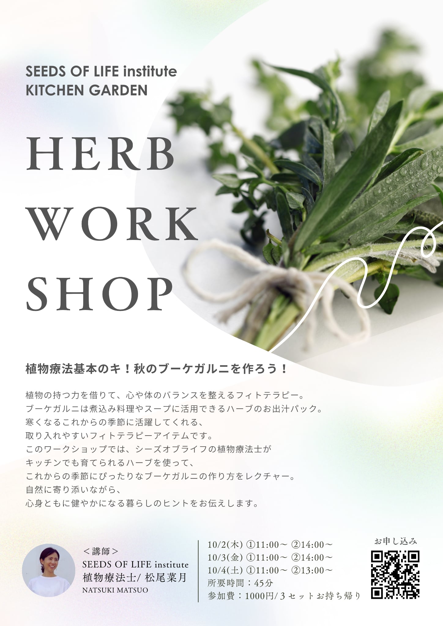 このワークショップでは、シーズオブライフの植物療法士がキッチンでも育てられるハーブを使って、これからの季節にぴったりなブーケガルニの作り方をレクチャー。植物の力を借りながら、心身ともに健やかになる暮らしのヒントをお伝えします。